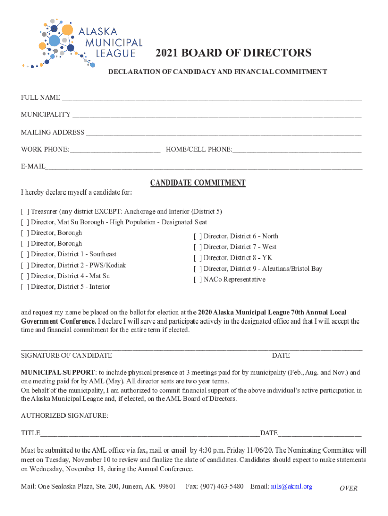 2021 BOARD OF DIRECTORS DECLARATION OF CANDIDACY AND FINANCIAL COMMITMENT FULL NAME ___ MUNICIPALITY ___ MAILING ADDRESS ___ WORK PHONE:___HOME/CELL PHONE:___ EMAIL___ I hereby declare myself a candidate