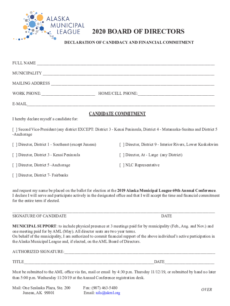 2020 BOARD OF DIRECTORSDECLARATION OF CANDIDACY AND FINANCIAL COMMITMENTFULL NAME ___ MUNICIPALITY ___ MAILING ADDRESS ___ WORK PHONE:___HOME/CELL PHONE:___ EMAIL___ I hereby declare myself a candidate