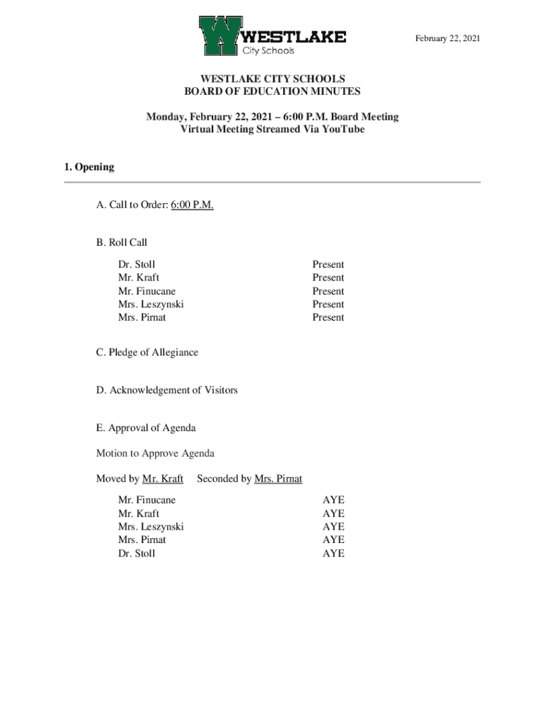 February 22, 2021WESTLAKE CITY SCHOOLS BOARD OF EDUCATION MINUTES Monday, February 22, 2021 6:00 P.M. Board Meeting Virtual Meeting Streamed Via YouTube1. Opening. Call to Order: 6:00 P.M.B. Roll