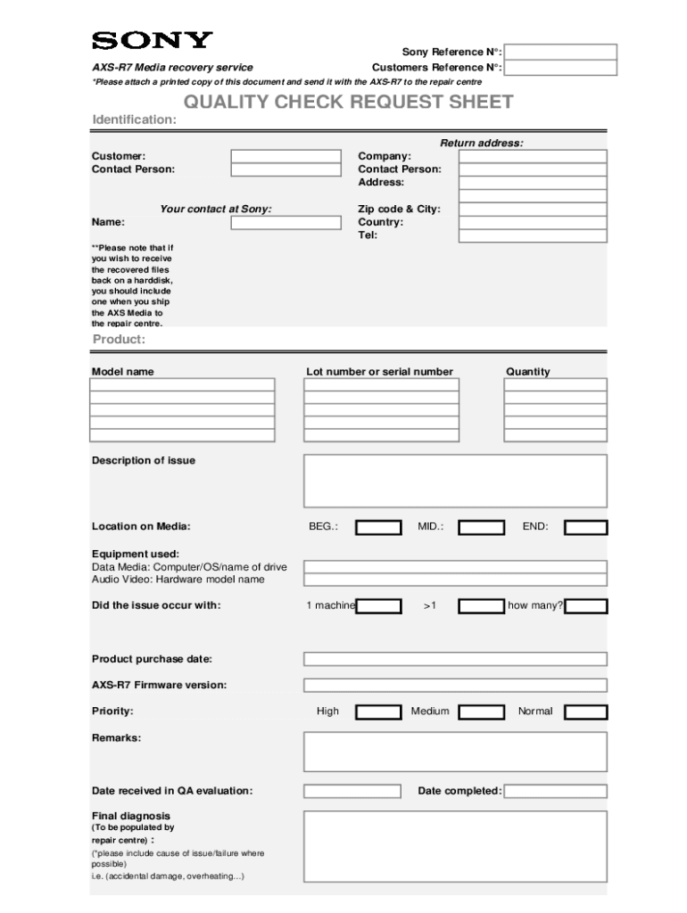 Sony Reference N: AXSR7 Media recovery serviceCustomers Reference N:*Please attach a printed copy of this document and send it with the AXSR7 to the repair centrality CHECK REQUEST SHEET Identification:
