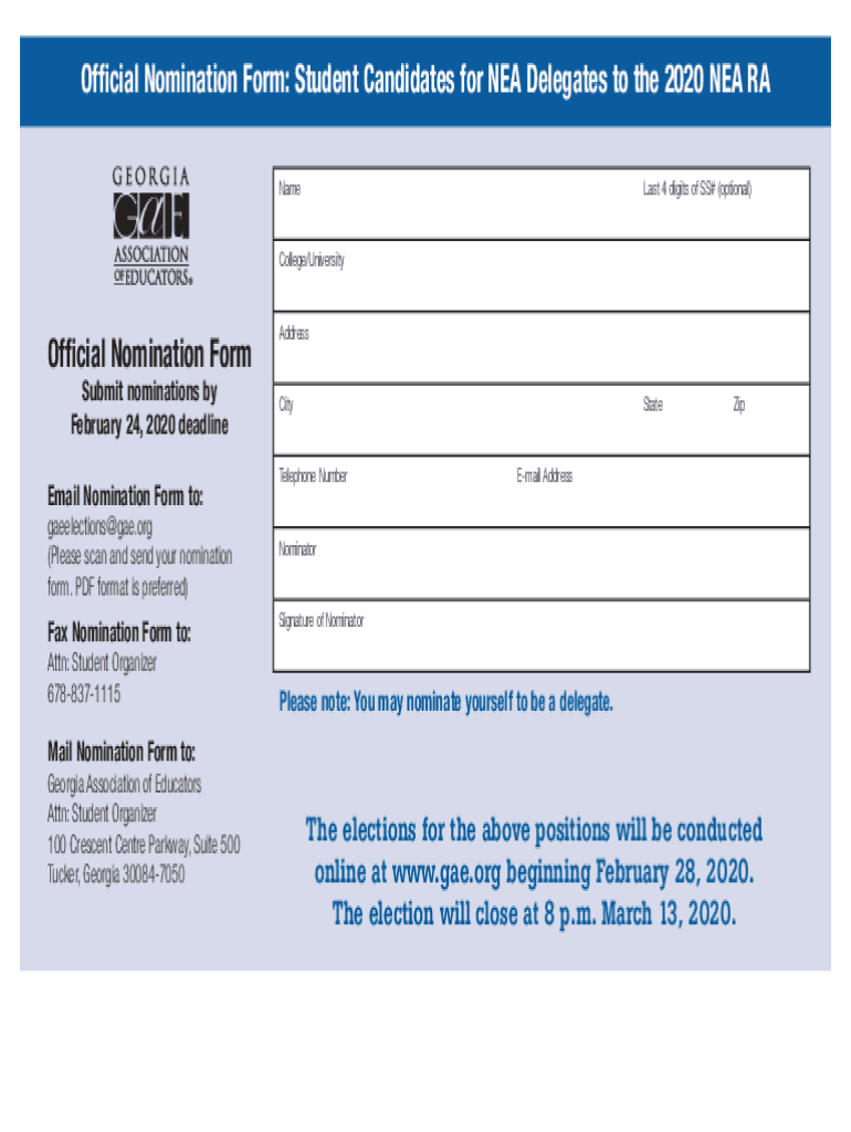 Official Nomination Form: Student Candidates for NEA Delegates to the 2020 NEA RA Nameless 4 digits of SS# (optional)College/UniversityOfficial Nomination Form Submit nominations by February 24, 2020,