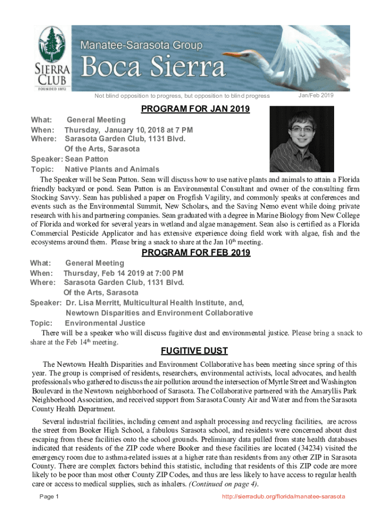 Not blind opposition to progress, but opposition to blind progress Jan/Feb 2019PROGRAM FOR JAN 2019 What: When: Where:General Meeting Thursday, January 10, 2018 at 7 PM Sarasota Garden Club, 1131