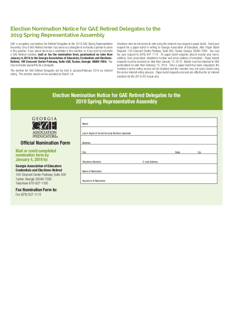 Election Nomination Notice for GAE Retired Delegates to the 2019 Spring Representative Assembly GAE is accepting nominations for Retired Delegates to the 2019 GAE Spring Representative Assembly. Only