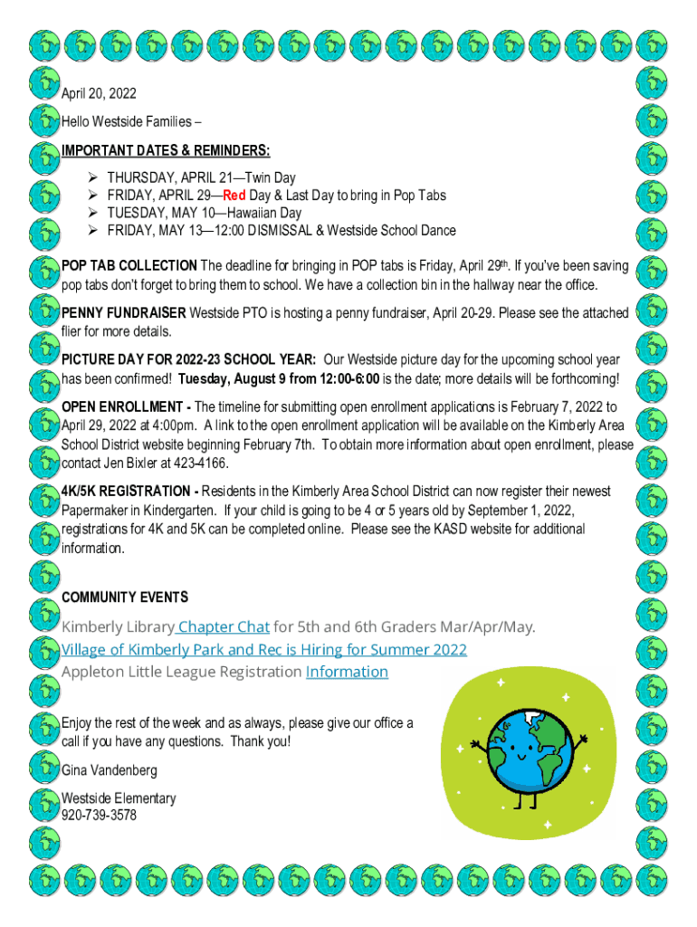 April 20, 2022, Hello Westside Families IMPORTANT DATES & REMINDERS: THURSDAY, APRIL 21Twin Day FRIDAY, APRIL 29Red Day & Last Day to bring in Pop Tabs TUESDAY, MAY 10Hawaiian Day FRIDAY, MAY 1312:00