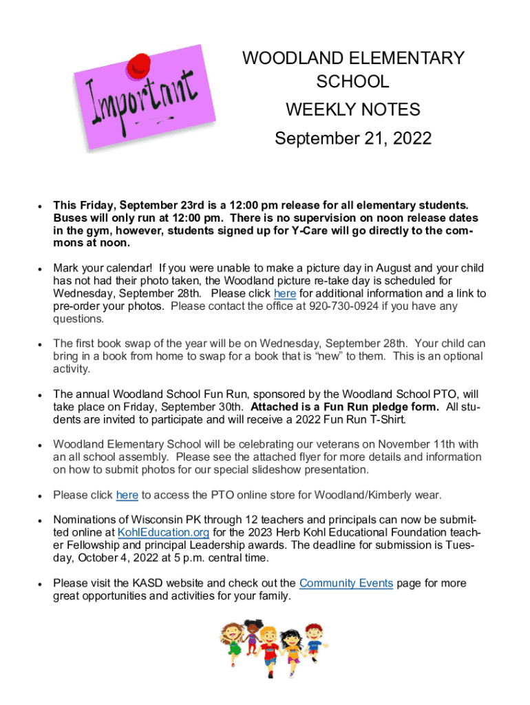 WOODLAND ELEMENTARY SCHOOL WEEKLY NOTES September 21, 2022This Friday, September 23rd is a 12:00 pm release for all elementary students. Buses will only run at 12:00 pm. There is no supervision on