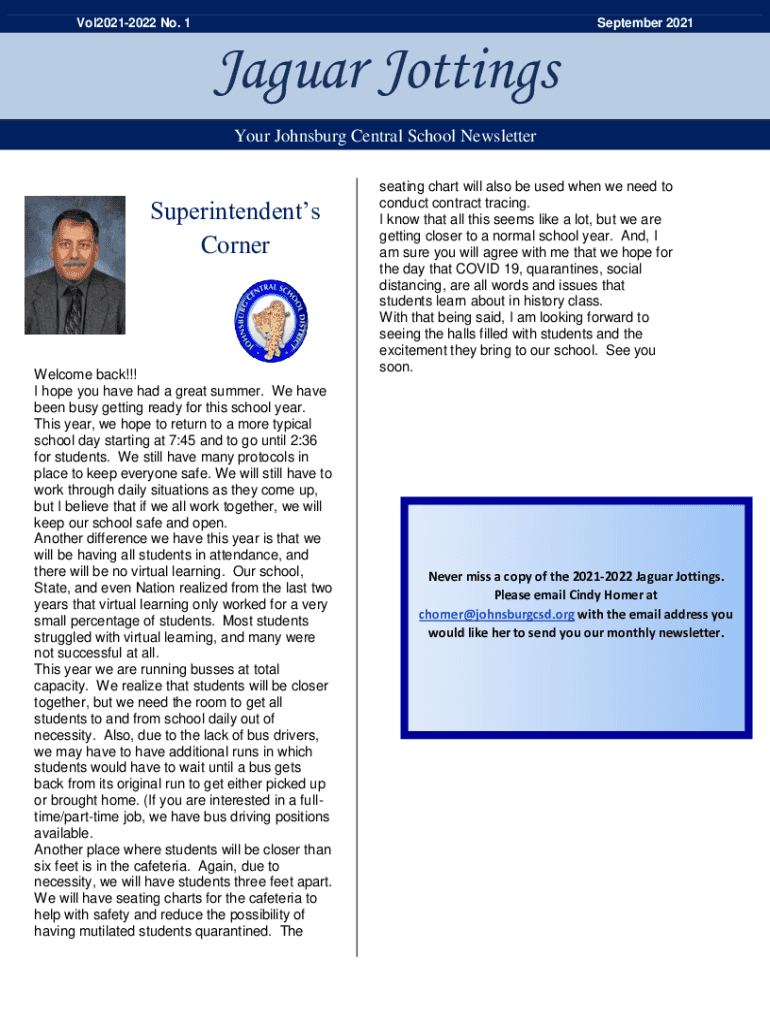Vol20212022 No. 1September 2021Jaguar Jottings Your Johns burg Central School NewsletterSuperintendents CornerWelcome back!!! I hope you have had a great summer. We have been busy getting ready for