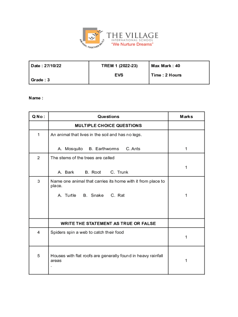 Date : 27/10/22TREM 1 (202223)Max Mark : 40EVSTime : 2 HoursGrade : 3Name :Q No :QuestionsMarksMULTIPLE CHOICE QUESTIONS 1An animal that lives in the soil and has no legs. A. Mosquito2B. Earthworms.