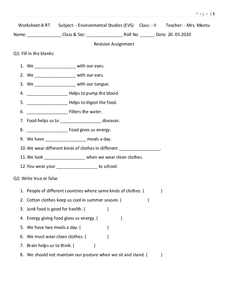 Page |1Worksheet8 Subject: Environmental Studies (EVS)Class: Teacher: Mrs. MeetuName: ___ Class & Sec: ___ Roll No. ___ Date: 20. 05.2020