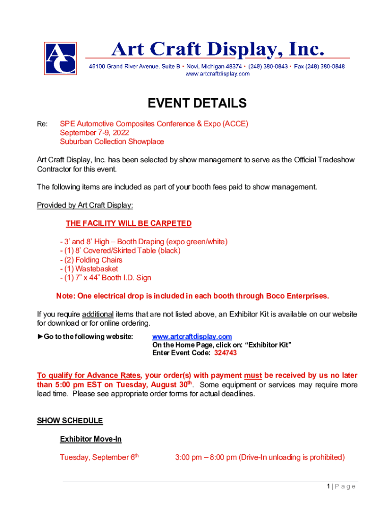 EVENT DETAILS Re:SPE Automotive Composites Conference & Expo (ACRE) September 79, 2022 Suburban Collection Showplace Art Craft Display, Inc. has been selected by show management to serve as the Official