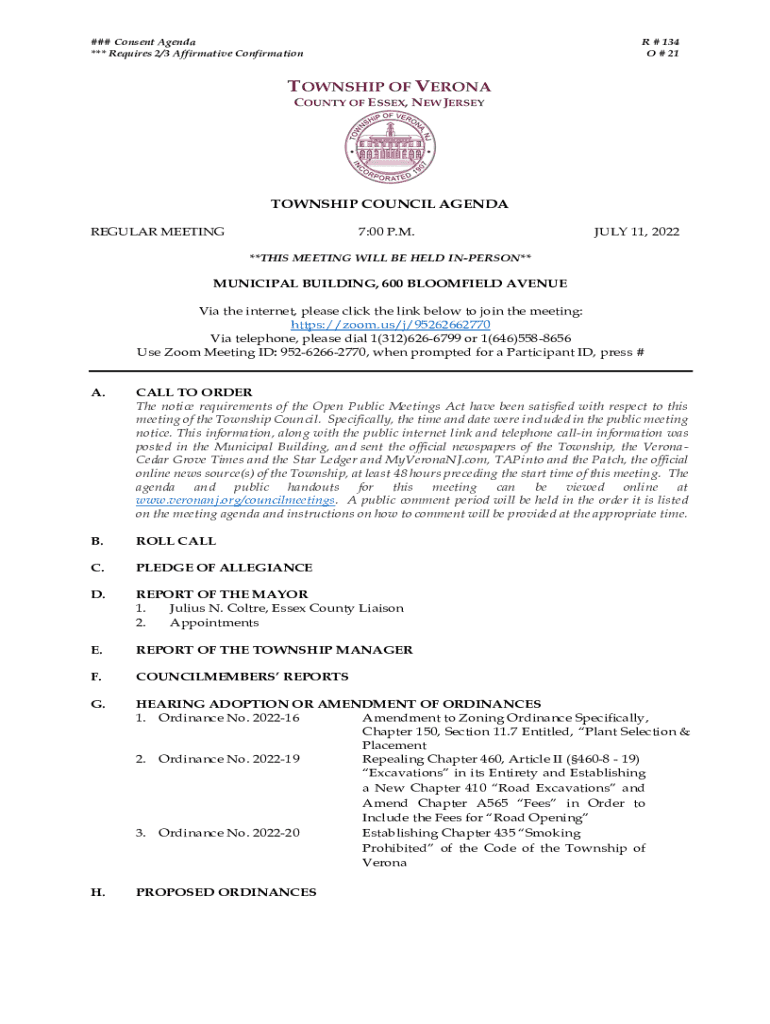 ### Consent Agenda *** Requires 2/3 Affirmative Confirmation # 134 O # 21TOWNSHIP COUNCIL AGENDA REGULAR MEETING7:00 P.M.JULY 11, 2022**THIS MEETING WILL BE HELD UNPERSON**MUNICIPAL BUILDING, 600