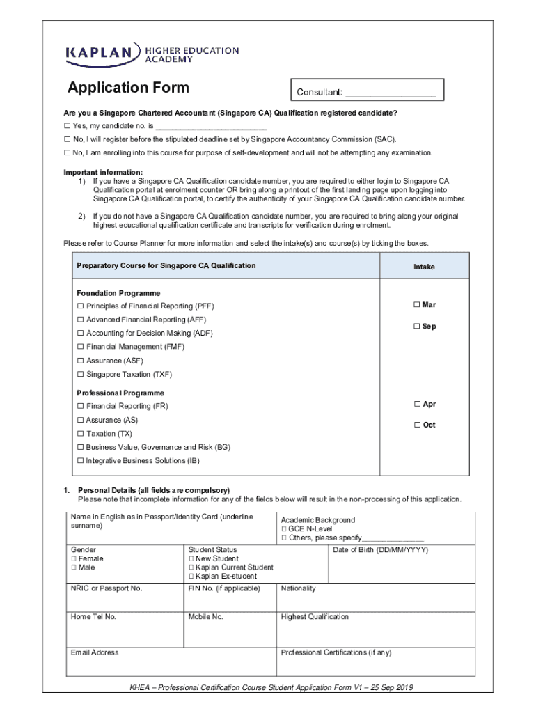 Application FormConsultant: ___Are you a Singapore Chartered Accountant (Singapore CA) Qualification registered candidate? Yes, my candidate no. is ___ No, I will register before the stipulated deadline
