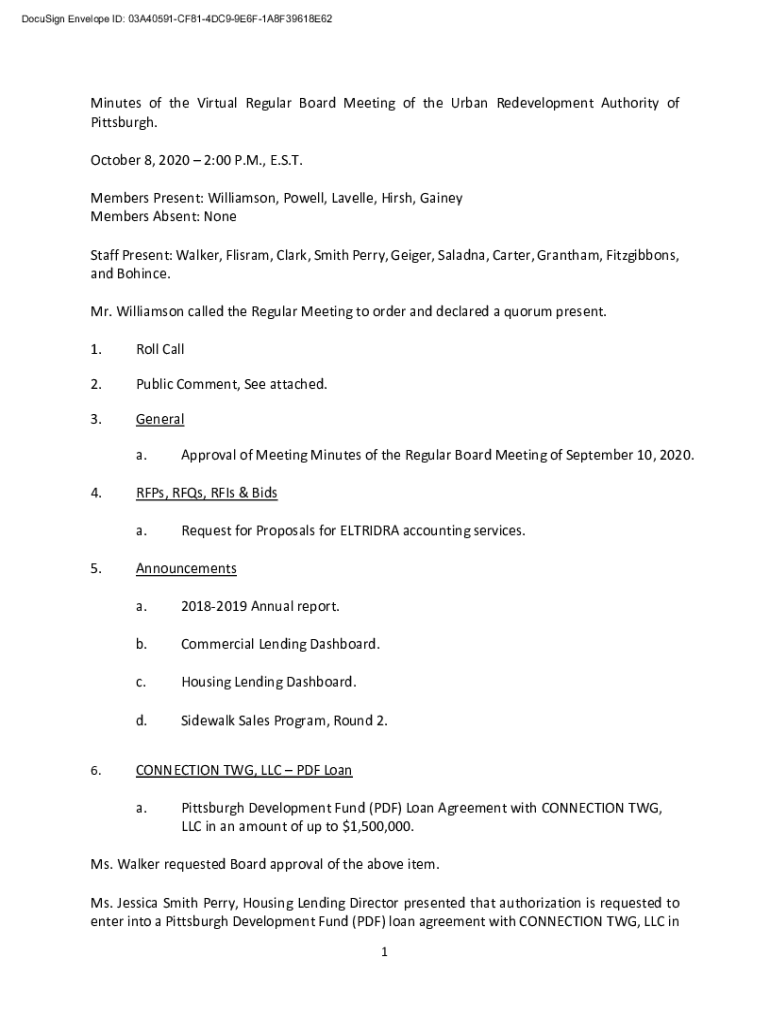 DocuSign Envelope ID: 03A40591CF814DC99E6F1A8F39618E62Minutes of the Virtual Regular Board Meeting of the Urban Redevelopment Authority of Pittsburgh. October 8, 2020 2:00 P.M., E.S.T. Members Present: