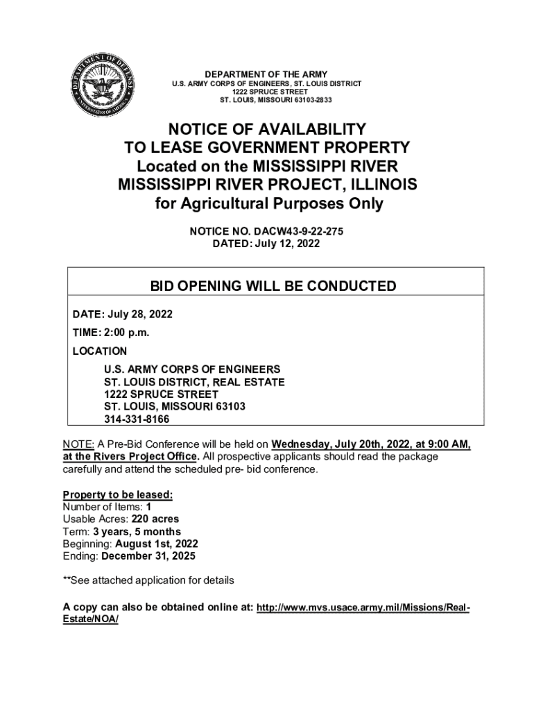 DEPARTMENT OF THE ARMY. S. ARMY CORPS OF ENGINEERS, ST. LOUIS DISTRICT 1222 SPRUCE STREET ST. LOUIS, MISSOURI 631032833NOTICE OF AVAILABILITY TO LEASE GOVERNMENT PROPERTY Located on the MISSISSIPPI