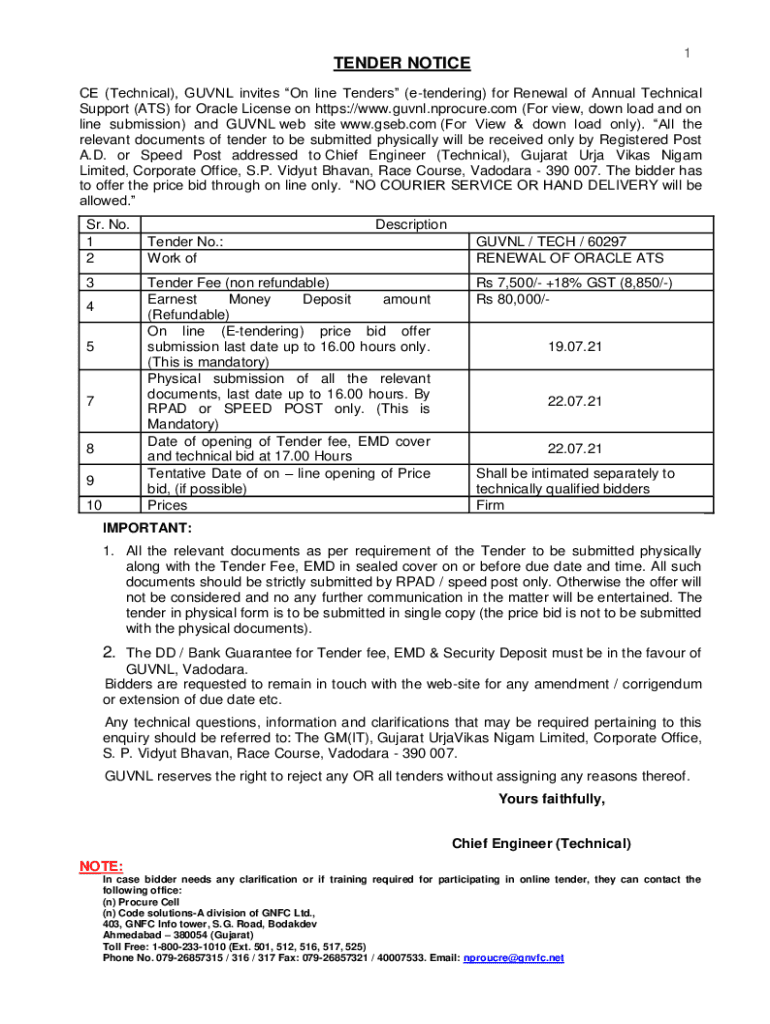1TENDER NOTICE CE (Technical), GUV NL invites online Tenders (tendering) for Renewal of Annual Technical Support (ATS) for Oracle License on https://www.guvnl.nprocure.com (For view, download and