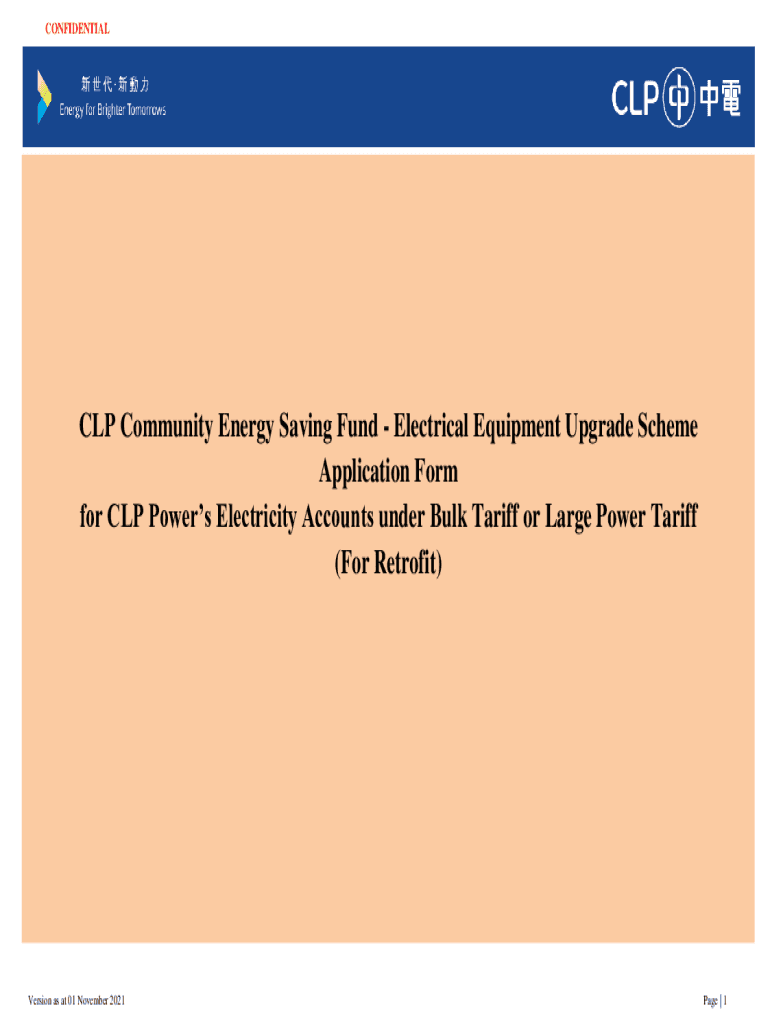 CONFIDENTIAL CLP Community Energy Saving Fund Electrical Equipment Upgrade Scheme Application Form for CLP Powers Electricity Accounts under Bulk Tariff or Large Power Tariff (For Retrofit)Version