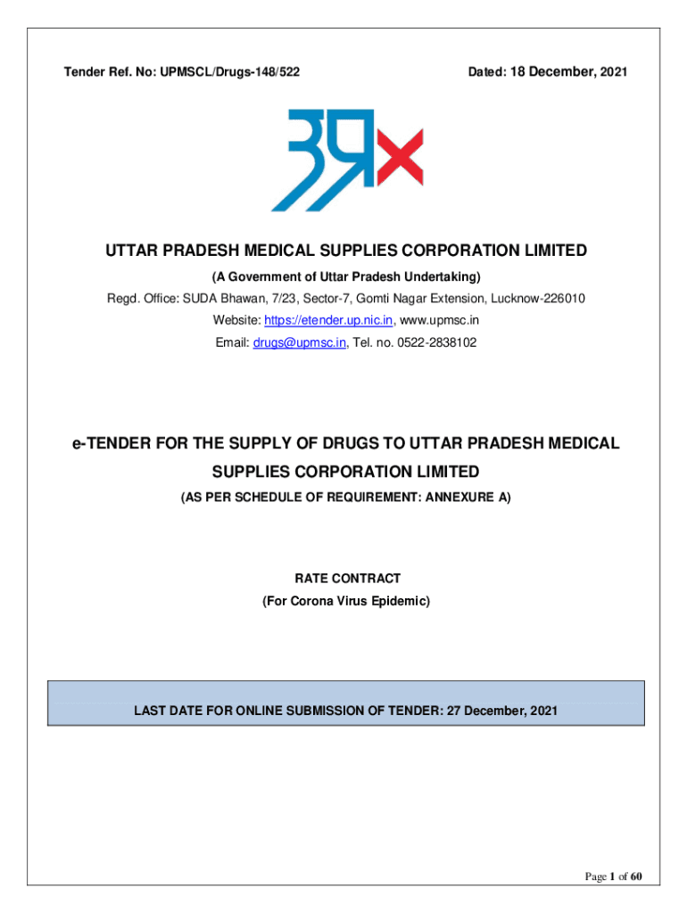 Tender Ref. No: UPMC/Drugs148/522Dated: 18 December, 2021UTTAR PRADESH MEDICAL SUPPLIES CORPORATION LIMITED (A Government of Uttar Pradesh Undertaking) Red. Office: SUDAN Shawn, 7/23, Sector7, Got