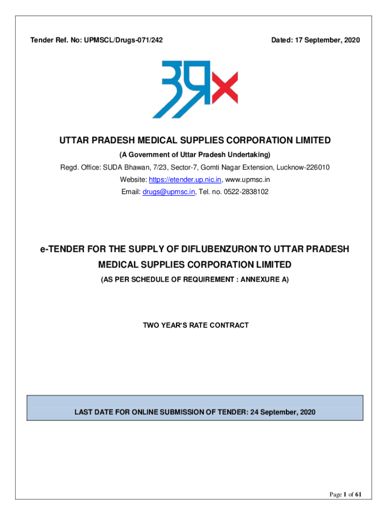Tender Ref. No: UPMC/Drugs071/242Dated: 17 September, 2020UTTAR PRADESH MEDICAL SUPPLIES CORPORATION LIMITED (A Government of Uttar Pradesh Undertaking) Red. Office: SUDAN Shawn, 7/23, Sector7, Got