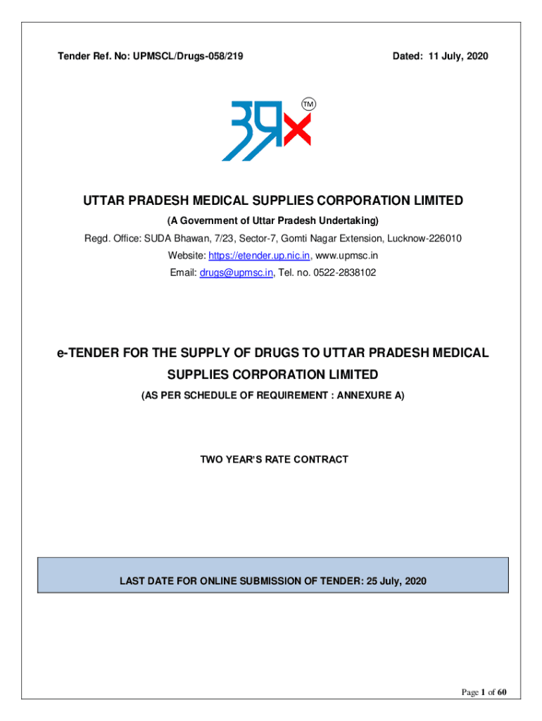 Tender Ref. No: UPMC/Drugs058/219Dated: 11 July, 2020UTTAR PRADESH MEDICAL SUPPLIES CORPORATION LIMITED (A Government of Uttar Pradesh Undertaking) Red. Office: SUDAN Shawn, 7/23, Sector7, Got Nagar
