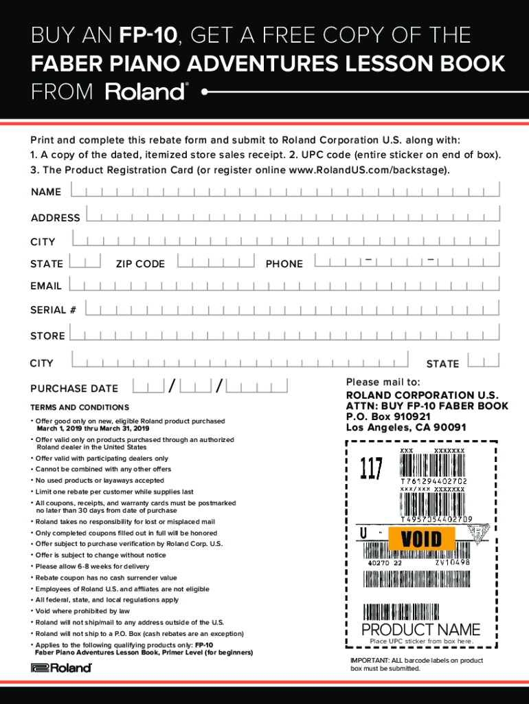 BUY AN FP10, GET A FREE COPY OF THE FABER PIANO ADVENTURES LESSON BOOK FROM Print and complete this rebate form and submit to Roland Corporation U.S. along with: 1. A copy of the dated, itemized store