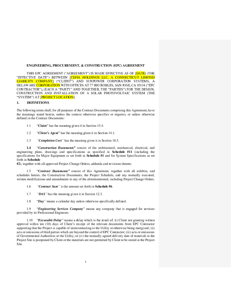 ENGINEERING, PROCUREMENT, & CONSTRUCTION (EPC) AGREEMENT THIS EPC AGREEMENT (\” AGREEMENT\”) IS MADE EFFECTIVE AS OF [DATE] (THE EFFECTIVE DATE) BETWEEN [CELIA HOLDINGS LLC, A CONNECTICUT LIMITED