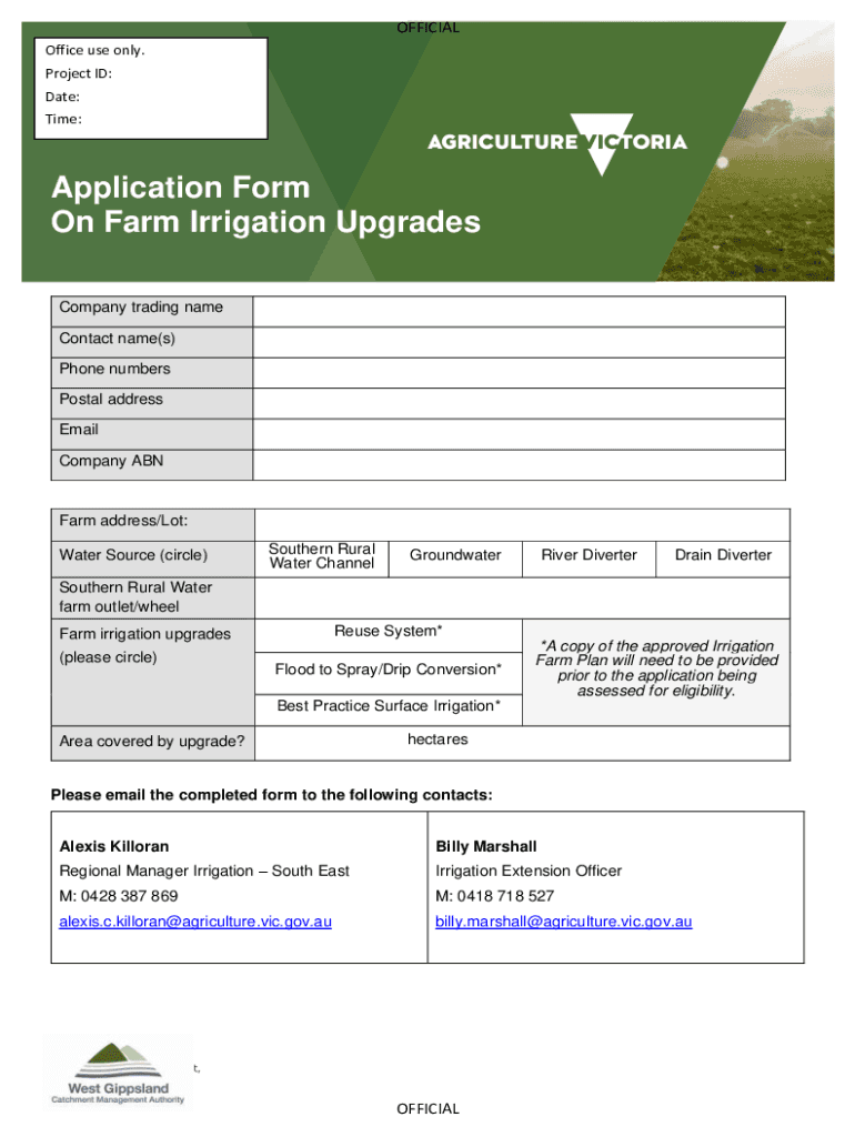 OFFICIAL Office use only. Project ID: Date: Time:Application Form On Farm Irrigation Upgrades Company trading name Contact name(s) Phone numbers Postal address Email Company Farm address/Lot: Water