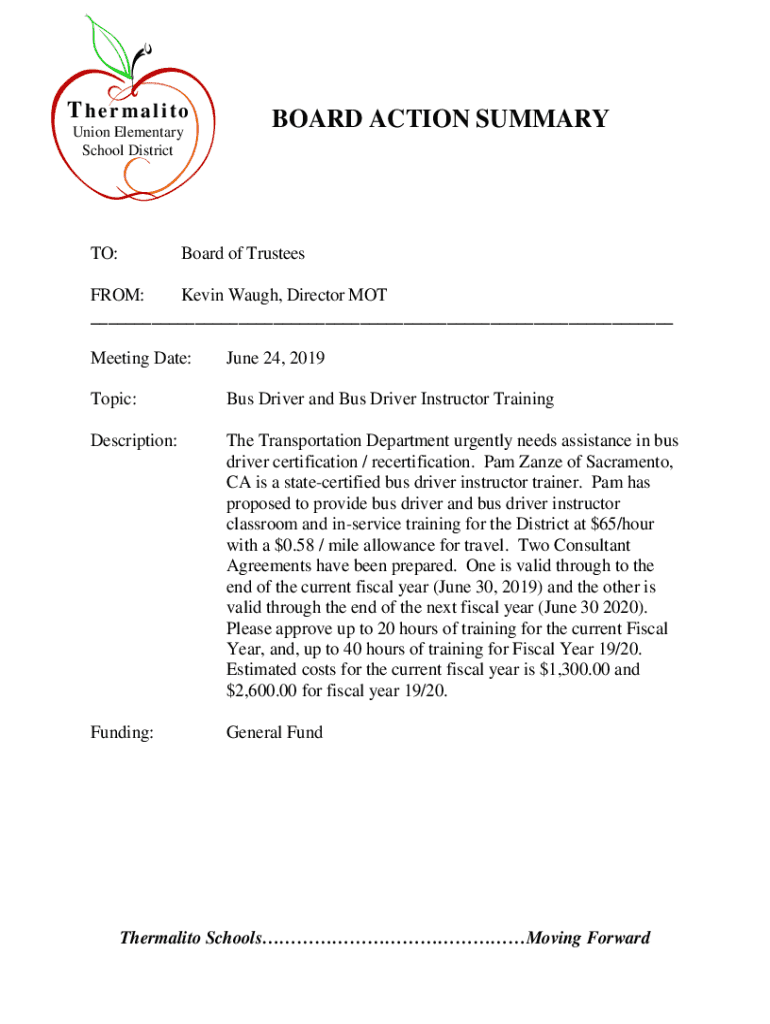 Thermalize Union Elementary School District TO:BOARD ACTION SUMMARYBoard of TrusteesFROM: Kevin Waugh, Director MOT ___ Meeting Date:June 24, 2019Topic:Bus Driver and Bus Driver Instructor TrainingDescription:The