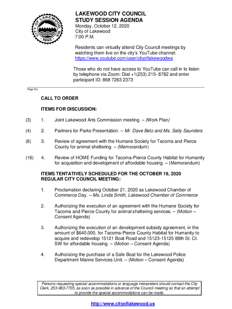 LAKEWOOD CITY COUNCIL STUDY SESSION AGENDA Monday, October 12, 2020, City of Lakewood 7:00 P.M. Residents can virtually attend City Council meetings by watching them live on the cities YouTube channel: