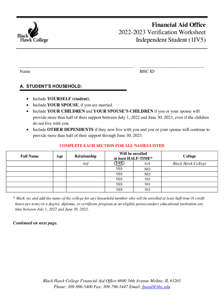 Financial Aid Office 20222023 Verification Worksheet Independent Student (1IV5)______Name BHC IDA. STUDENTS HOUSEHOLD: Include YOURSELF (student), Include YOUR SPOUSE, if you are married. Include