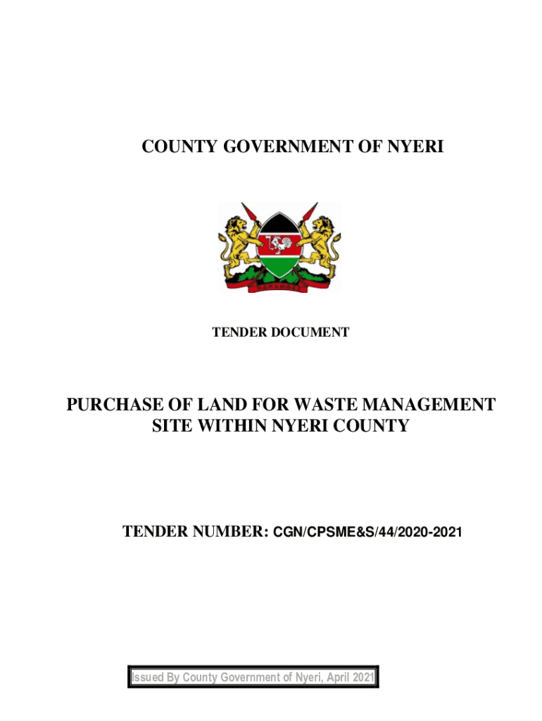 COUNTY GOVERNMENT OF NYERITENDER DOCUMENTPURCHASE OF LAND FOR WASTE MANAGEMENT SITE WITHIN MYERS CONTENDER NUMBER: CGN/CASES/44/20202021Issued By County Government of Myers, April 2021TABLE OF CONTENTS