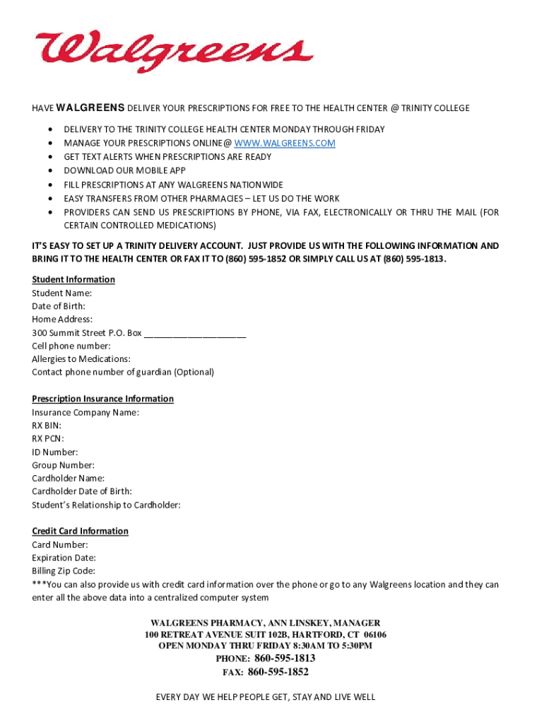 HAVE WALGREENS DELIVER YOUR PRESCRIPTIONS FOR FREE TO THE HEALTH CENTER @ TRINITY COLLEGE DELIVERY TO THE TRINITY COLLEGE HEALTH CENTER MONDAY THROUGH FRIDAY MANAGE YOUR PRESCRIPTIONS ONLINE WWW.WALGREENS.COM