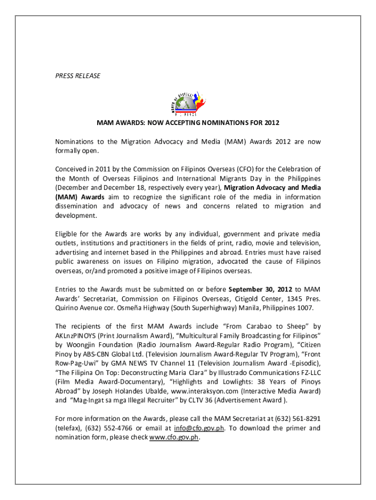 PRESS RELEASE MAM AWARDS: NOW ACCEPTING NOMINATIONS FOR 2012 Nominations to the Migration Advocacy and Media (MAM) Awards 2012 are now formally open. Conceived in 2011 by the Commission on Filipinos