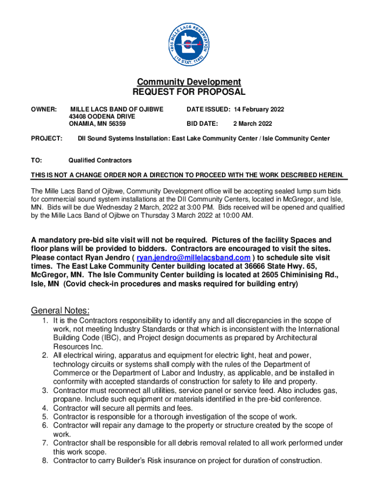 Community Development REQUEST FOR PROPOSAL OWNER:PROJECT:TO:MILE LACK BAND OF OJIBWA 43408 MODENA DRIVE OBAMA, MN 56359DATE ISSUED: 14 February 2022 BID DATE:2 March 2022DII Sound Systems Installation: