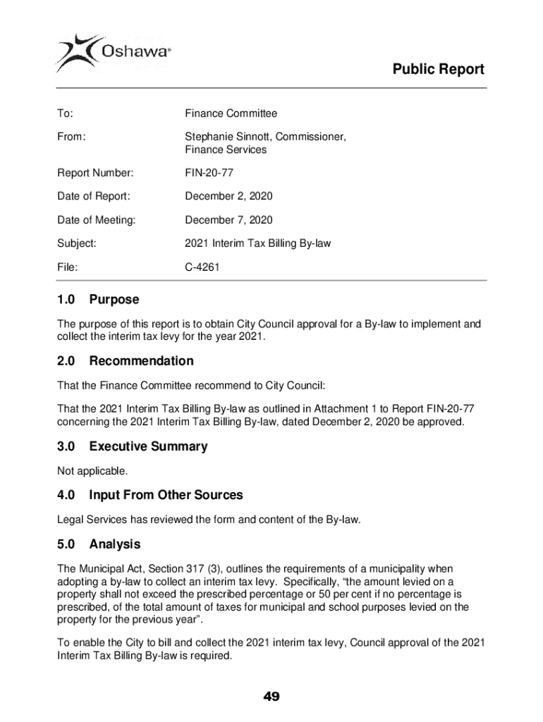 Public Report To:Finance CommitteeFrom:Stephanie Sennett, Commissioner, Finance ServicesReport Number:FIN2077Date of Report:December 2, 2020Date of Meeting:December 7, 2020Subject:2021 Interim Tax