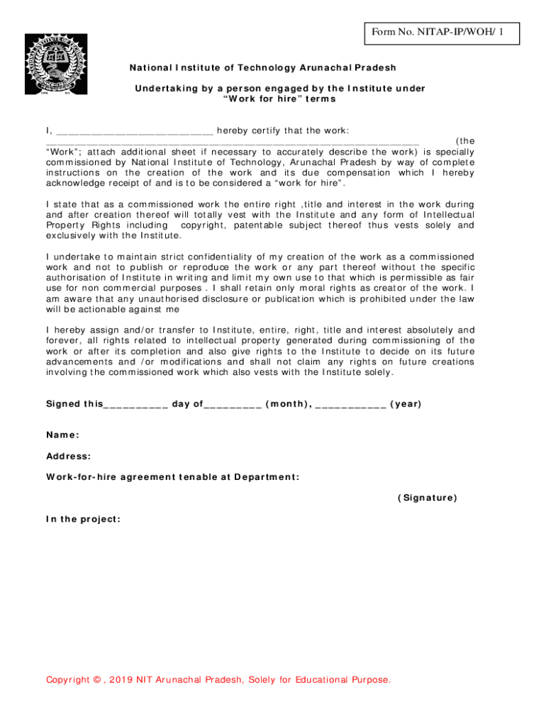 Form No. VITAMIN/WON/ 1National Institute of Technology Arunachal Pradesh Undertaking by a person engaged by the Institute under Work for hire terms, ___ hereby certify that the work: ___ (the Work;