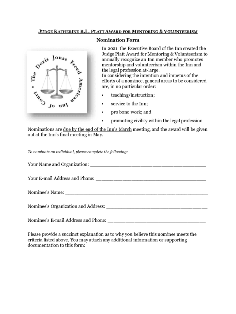 JUDGE KATHERINE B.L. PLATT AWARD FOR MENTORING & VOLUNTEERISM Nomination Form In 2021, the Executive Board of the Inn created the Judge Platt Award for Mentoring & Volunteerism to annually recognize