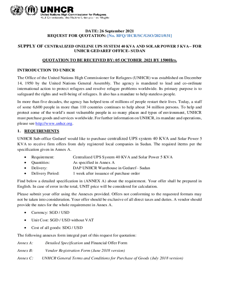 DATE: 26 September 2021 REQUEST FOR QUOTATION: [No. RFQ/ HER/SC/GSO/2021/031]SUPPLY OF CENTRALIZED ONLINE UPS SYSTEM 40 AVA AND SOLAR POWER 5 AVA FOR UNHCR GEARED OFFICE SUDAN QUOTATION TO BE RECEIVED