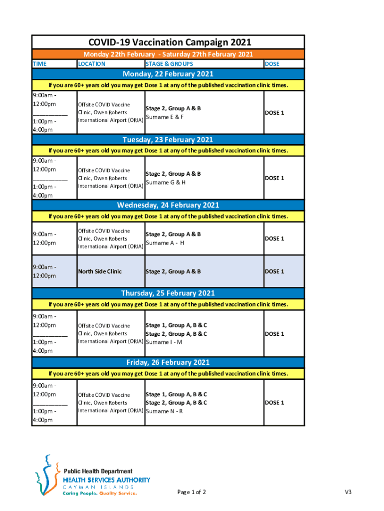 COVID-19 Vaccination Campaign 2021Monday 22nd February Saturday 27th February 2021 TIMELOCATIONSTAGE & GROUPS Monday, 22 February 2021DOSEIf you are 60+ years old you may get Dose 1 at any of the
