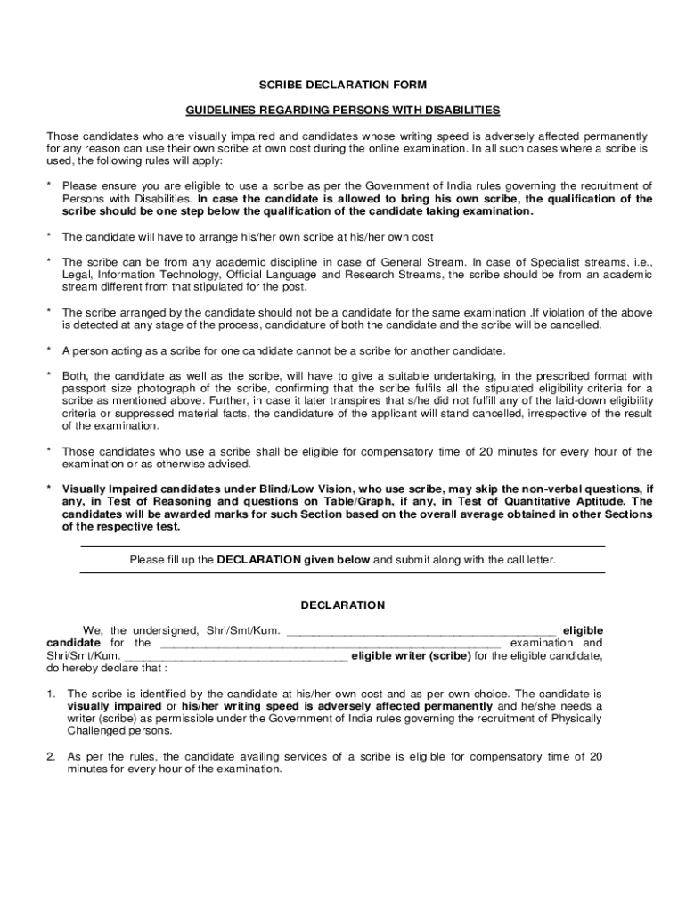 SCRIBE DECLARATION FORM GUIDELINES REGARDING PERSONS WITH DISABILITIES Those candidates who are visually impaired and candidates whose writing speed is adversely affected permanently for any reason