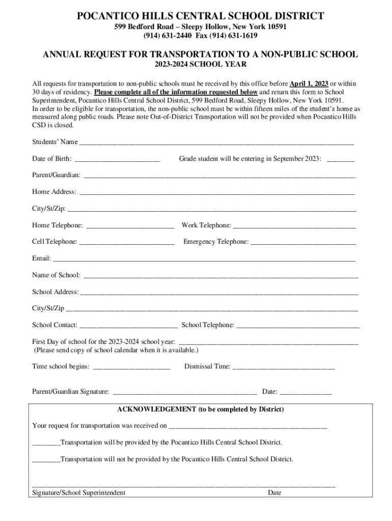 ROMANTIC HILLS CENTRAL SCHOOL DISTRICT 599 Bedford Road Sleepy Hollow, New York 10591 (914) 6312440 Fax (914) 6311619ANNUAL REQUEST FOR TRANSPORTATION TO A NONPUBLIC SCHOOL 20232024 SCHOOL YEAR All