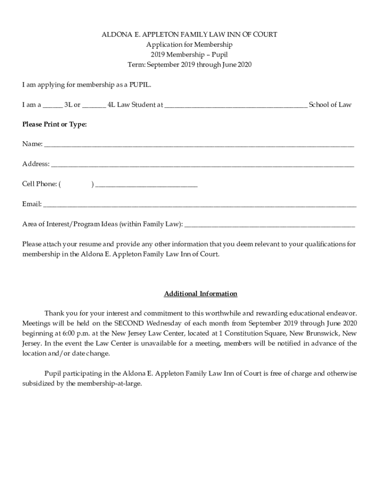 ALONG E. APPLETON FAMILY LAW INN OF COURT Application for Membership 2019 Membership Pupil Term: September 2019 through June 2020 I am applying for membership as a PUPIL. I am a ___ 3L or ___ 4L Law