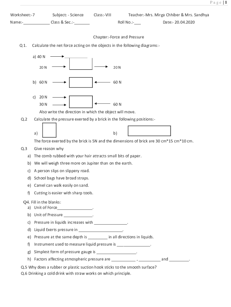 Page |1Worksheet:7Subject: ScienceClass:VIIITeacher:Mrs. Mira Chamber & Mrs. SandhyaName:___ Class & Sec.:___Roll No.:___Date: 20.04.2020Chapter:Force and Pressure Q 1. Calculate the net force acting