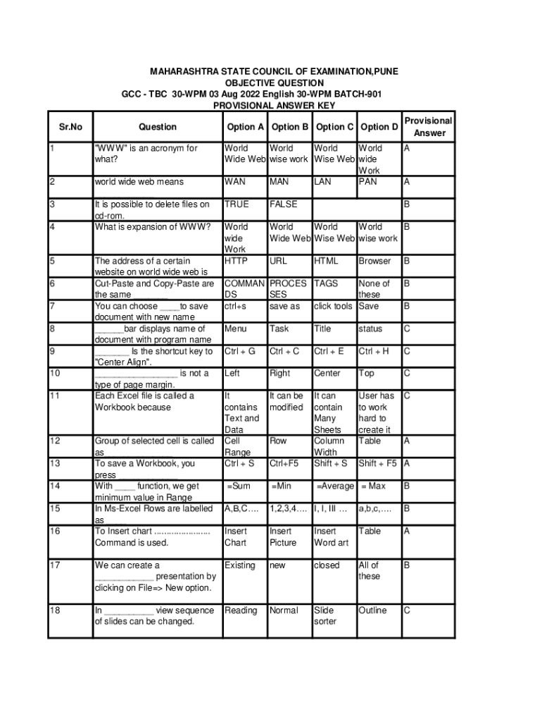 MAHARASHTRA STATE COUNCIL OF EXAMINATION, PUNE OBJECTIVE QUESTION GCC TBC 30WPM 03 Aug 2022 English 30WPM BATCH901 PROVISIONAL ANSWER KEY Sr. NoQuestion1\” WWW\” is an acronym for what?2world