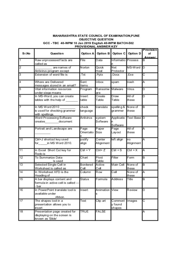 MAHARASHTRA STATE COUNCIL OF EXAMINATION, PUNE OBJECTIVE QUESTION GCC TBC 40WPM 10 Jan 2019 English 40WPM BATCH502 PROVISIONAL ANSWER KEY Sr. No 1QuestionOption A Option B Option C Option Provision
