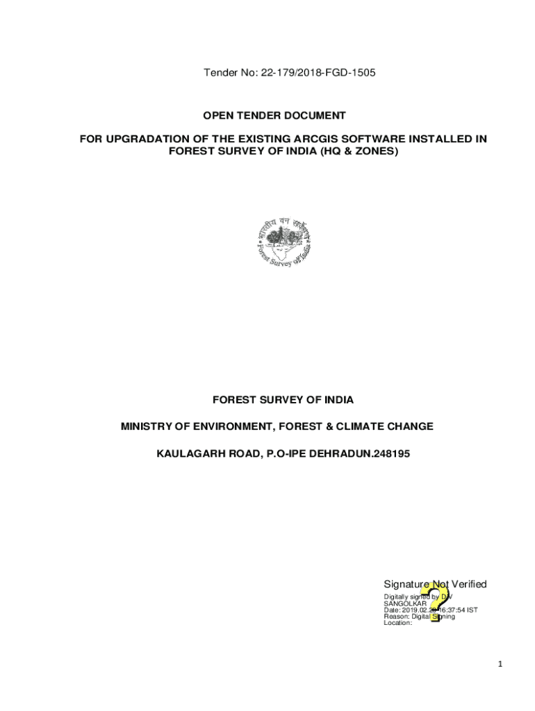 Tender No: 22179/2018FGD1505OPEN TENDER DOCUMENT FOR Upgrade OF THE EXISTING AR CGIS SOFTWARE INSTALLED IN FOREST SURVEY OF INDIA (HQ & ZONES)FOREST SURVEY OF INDIA MINISTRY OF ENVIRONMENT, FOREST