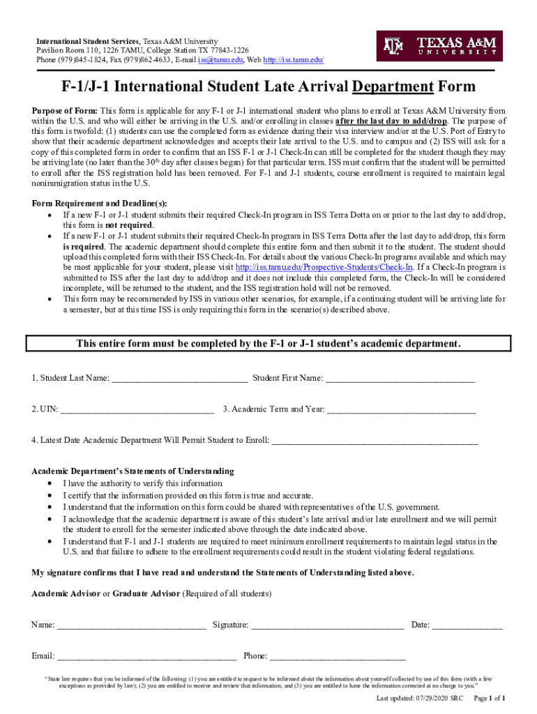 International students who are applying for a late arrival to the designated institution need to fill out the F-1J-1 international student late form.