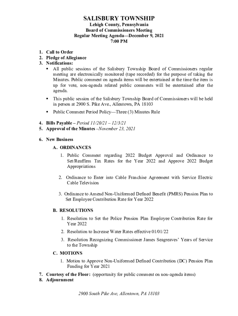 SALISBURY TOWNSHIP Lehigh County, Pennsylvania Board of Commissioners Meeting Regular Meeting Agenda December 9, 2021 7:00 PM 1. Call to Order 2. Pledge of Allegiance 3. Notifications: All public