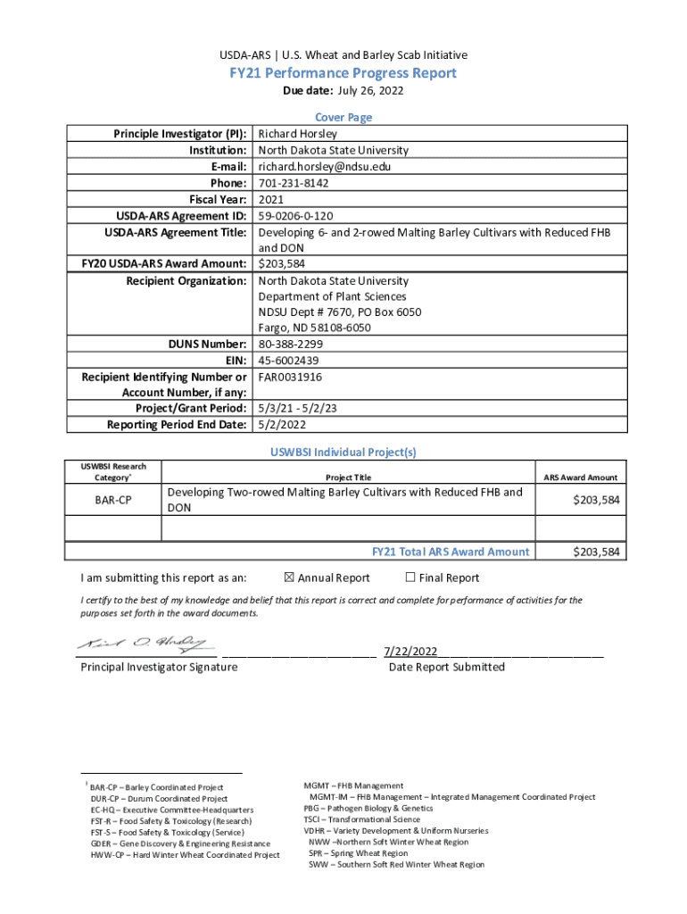 STARS | U.S. Wheat and Barley Scab InitiativeFY21 Performance Progress Report Due date: July 26, 2022Principle Investigator (PI): Institution: Email: Phone: Fiscal Year: STARS Agreement ID: STARS