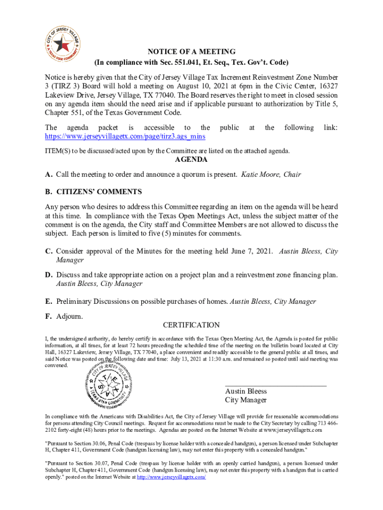 NOTICE OF A MEETING (In compliance with Sec. 551.041, ET. Seq., Tex. Govt. Code) Notice is hereby given that the City of Jersey Village Tax Increment Reinvestment Zone Number 3 (TIRE 3) Board will