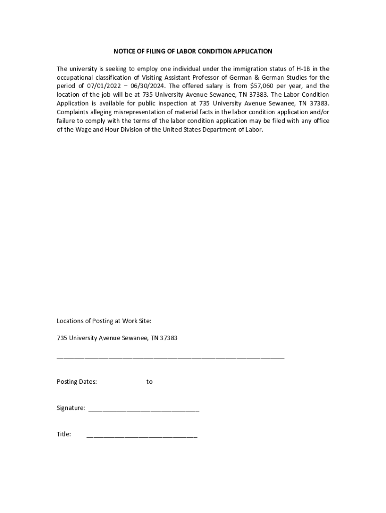 Get the free Notice of Filing of Labor Condition Application - Sewanee