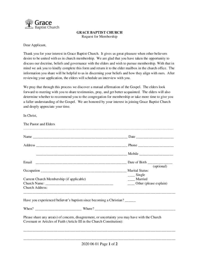 GRACE BAPTIST CHURCH Request for Membership Dear Applicant, Thank you for your interest in Grace Baptist Church. It gives us great pleasure when other believers desire to be united with us in church